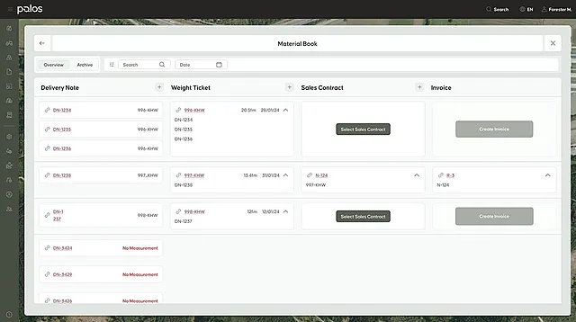Optimize your accounting and billing with the material book. Create and send invoices, delivery notes, and measurement lists more easily than ever before. Whether it's timber sales, batch/pile recording, or transparent reports, it's all in one system.