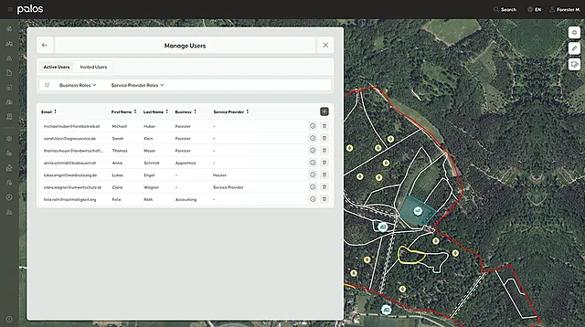 Manage the members of your forestry association efficiently and allow everyone to view their forest areas and all relevant information directly in palos. This makes collaboration even more transparent and productive.
